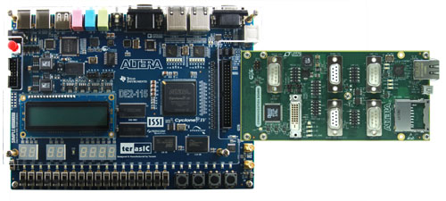 接口部分除了承袭广受欢迎的 DE2 系列多媒体开发平台界面外, 还新增了接口以支持包括千兆以太网(GbE)在内的主流协议。HSMC 插槽提供通过 HSMC 子卡和电缆之附加功能和连接。亦可通过 HSMC 电缆将多片的 FPGA 板上透过 HSMC 插槽连接起来,以实现大型的 ASIC 原型开发之需求。